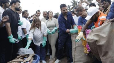 मुंबई के जुहू बीच पर सफाई अभियान में अक्षय कुमार के साथ दिखीं अमृता फडणवीस, कपड़ों को लेकर सोशल मीडिया पर मची हलचल