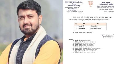भाजपा प्रदेश अध्यक्ष हेमंत खंडेलवाल के हस्ताक्षरों से जारी आदेश में कहा गया है कि पार्टी के राष्ट्रीय अध्यक्ष जेपी नड्डा की सहमति से प्रदेश मोर्चा प्रभारी मनोरंजन मिश्रा, प्रदेश...