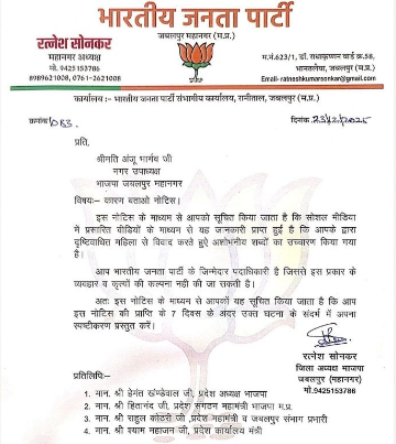 दरअसल, वीडियो वायरल में दिव्‍यांग दृ‍ष्ट‍िहीन महिला से बदसलूकी करने वाली भाजपा नेत्री अंजू भार्गव नगर उपाध्‍यक्ष है. उनकी इस बदसूलकी की वीडियो वायरल होने के बाद भाजपा के जबलपुर महानगर अध्‍यक्ष रत्नेश सोनकर ने भाजपा नेत्री अंजू भार्गव को स्‍पष्टीकरण के लिए नोटिस जारी किया है. नोटिस में भाजपा नेत्री को जवाब देने के लिए 7 दिन का समय दिया है।