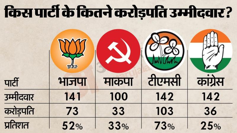 पार्टीवार औसत: तृणमूल कांग्रेस के उम्मीदवारों की औसत संपत्ति सबसे अधिक 5.05 करोड़ रुपये है। इसके बाद भाजपा (3.28 करोड़), माकपा (1.22 करोड़) और कांग्रेस (1.04 करोड़) का स्थान है।